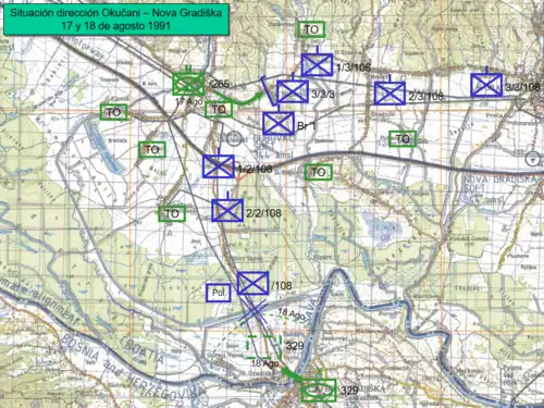 - La 329.ª Brigada Blindada[17] cuyo pasaje del río Sava se produjo a mediados de agosto. En la primera fase de las operaciones, la Brigada fue detenida sobre el canal Strug y luego se dirigió hacia Nova Gradiška con la intención de desbloquear las guarniciones JNA en Đakovo y Našice y para fusionarse con el Cuerpo Novi Sad y la División de Guardias 1 (procedentes del Eslavonia Oriental). A mediados de octubre, el ZNG estabilizó la línea de defensa al oeste de Nova Gradiška. La Brigada Blindada se vio obligada a pasar a la defensa.[18]
