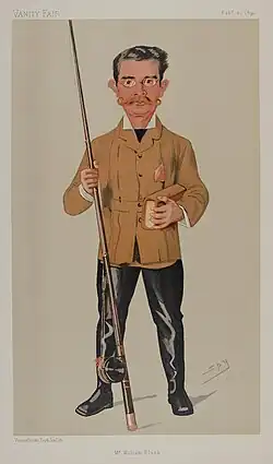 William Black (1841-1898), periodista y novelista escocés, publicó en 1864 su primera novela, James Merle, una autobiografía, que pasó absolutamente desapercibida por las revistas literarias.[23] Su experiencia como corresponsal de guerra en la Selva Negra durante la guerra austro-prusiana (1866) contribuyó al éxito de su excelente novela In Silk Attire (Con atuendo de seda, 1869), parte de la cual estaba ambientada allí. Ya en 1867 había producido una buena novela en Amor o matrimonio, que perdió popularidad por discutir cuestiones sociales delicadas.[24] Después de su primer éxito en la ficción, abandonó el periodismo, y se dedicó por completo a la producción novelística. Durante casi treinta años conservó con éxito el favor popular.[25] El éxito de Con atuendo de seda ayudó a Kilmeny (1870), una historia igualmente deliciosa por sus esbozos de la vida artística londinense y sus paisajes rurales, y a Un monarca de Mincing Lane; pero el primer verdadero triunfo del autor fue conseguido por Una hija de Heth (1871). Aquí fue más afortunado en su tema, describiendo la domesticación de una briosa mujer francesa en una familia puritana escocesa. Las extrañas aventuras de un faetón (1872) fue si cabe más exitosa, e introdujo lo que se convertiría en característica particular de Black: una combinación tan exhaustiva de escenas de experiencias reales de viajes y deporte con aventuras ficticias que el lector a veces difícilmente sabía si estaba leyendo un libro de viajes o una novela.[26] Black alcanzó su punto álgido en Una princesa de Tule (1873),[27] otro gran éxito que más tarde sería adaptado al teatro musical. Tanto en este libro como en Madcap Violet (1876), como anteriormente en Una hija de Heth, la delineación del personaje femenino constituía un atractivo especial.[26] Retirado del periodismo en 1875, desde entonces se dedicó por completo a la literatura de ficción. Muchos otros títulos (varias colecciones de relatos y más de veinte novelas) se sumaron antes de su muerte en 1898, entre los que cabe mencionar[27] Green Pastures and Piccadilly (1877); Macleod of Dare (1878); White Wings (Alas blancas, 1880); Sunrise (Amanecer, 1880),[26] una novela de intriga política internacional; La bella infeliz (1881), una de las varias historias ambientadas en Brighton;[26] Shandon Bells (1882), en gran parte ambientada en Irlanda; Yolanda (1883), que en parte se ocupa de la drogadicción; Aventuras en Tule (1883); Judith Shakespeare (1884), una novela histórica protagonizada por la hija del célebre dramaturgo; Las mujeres sabias de Inverness y otras misceláneas (1885); White Heather (Brezo blanco, 1885);[26] Las extrañas aventuras de una casa flotante (1888); La penitencia de John Logan y otros cuentos (1889); El nuevo príncipe Fortunato (1890), una novela sobre la vida teatral de Londres; ¡Mantente firme, Craig Royston! (1890);[26] Donald Ross of Heimra (1891); Highland Cousins (1894); y Wild Eelin (1898).[25] Sus mejores historias son las que estaban ambientadas en medio de las ventosas montañas de su tierra natal, o sobre la cubierta de un velero en el mar frente a las agrestes costas. Sus descripciones de tales escenarios son sencillas y pintorescas.[25]