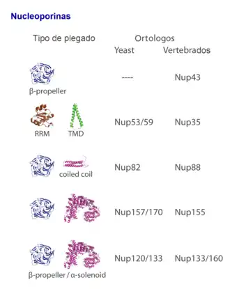 Las Nucleoporinas están agrupadas en subcomplejos que presentan funciones, composiciones, propiedades bioquímicas y posiciones específicas.[1]