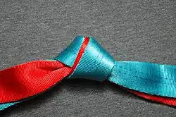Las puntas se debe dejar sobresalgan por lo menos unos 10 cm y el nudo debe "afirmarse" apretándolo cargando con toda la fuerza del cuerpo. Los extremos pueden fijarse con una cinta adhesiva o coserlos superficialmente a los otros trozos para evitar que puedan deslizarse hacia el nudo.[1]