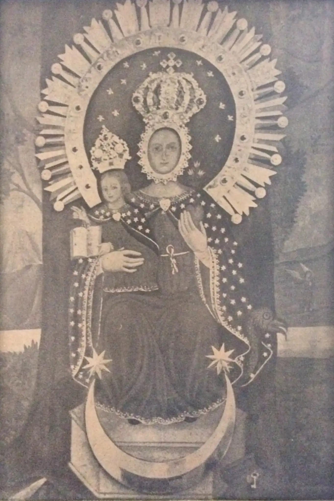 Sostiene al Niño Jesús en su rodilla derecha, vestido de túnica blanca. La mano derecha de la Virgen delicadamente sostiene el torso de Jesús que pareciera querer saltar lleno de alegría hacia los brazos del fiel que observa la imagen y cuyos rostros se cruzan entre una sonrisa; el Divino Niño, Palabra Eterna que se hizo carne, sostiene en su mano izquierda un evangeliario que aprieta en su pecho junto a su corazón, mientras que con la mano derecha, con un gesto lleno de ternura, da la bendición al fiel que observa la imagen.