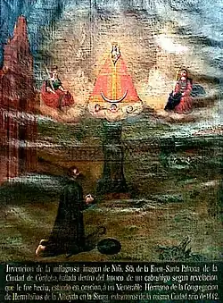 Invencion de la milagrosa imagen de Ntra. Sra. de la Fuen-Santa Patrona de la Ciudad de Cordoba, hallada dentro del tronco de un cabrahigo segun revelacion que le fue hecha, estando en oracion, à un Venerable Hermano de la Congregacion de Hermitaños de la Albayda en la Sierra extramuros de la misma Ciudad año de 1442.ESPEJO SAAVEDRA PINXIT ANNO 1813.