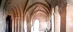 La sencillez del interior del templo contrasta con una mayor ornamentación exterior.[59] El atrio está constituido por tres arcos de medio punto sustentados por columnas pareadas, situadas a su vez sobre un zócalo. Los arcos exteriores albergan en su interior otros dos arcos que se apoyan sobre sus respectivas columnas y capiteles.[60][61] Protege el pórtico un pequeño alero sostenido por canes labrados con motivos como contorsionistas, figuras humanas, cabezas de animal, bolas o el ajedrezado jacobeo.[62]