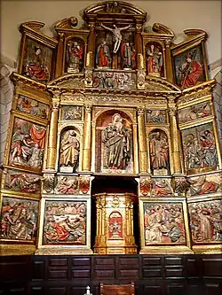 - ↑ Biurrun Sótil, 1928, p. 168. «Su primer cuerpo desarrolla dentro de sencillos marcos las historias de la Última Cena, del Lavatorio, del Prendimiento y Camino del Calvario. Un entrepaño con los Evangelistas lo separa del segundo cuerpo, integrado por los relieves de la Anunciación y Visitación y los bultos de San Pedro y San Pablo; y sobre ellos los cuatro Padres de la Iglesia latina. La hornación central cobija la imagen de la Virgen de pie con el Niño, y a guisa de entablamiento un papel con la Adoración de los Reyes Magos. A los lados del Calvario, las Santas vírgenes y mártires.»