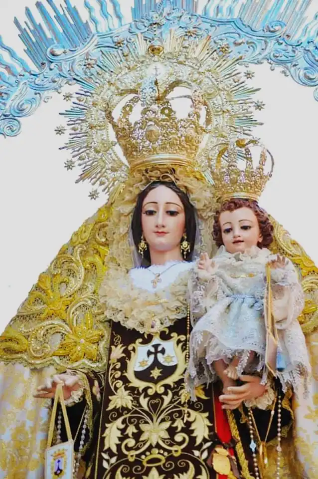 La imagen de la Santísima Virgen es una obra de vestir, de finales del siglo XIX de autor anónimo, con una medida aproximada de 1,20 metros. Siendo la imagen del Divino Infante obra posterior posiblemente realizada en el siglo XX y también de autor anónimo. La imagen viste todo el año con saya marrón y portando el tradicional escapulario carmelita, dado por ella a Simón Stock.