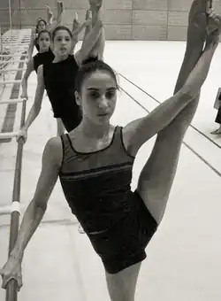 Varias componentes de la selección nacional realizando un equilibrio en posición de attitude. -
