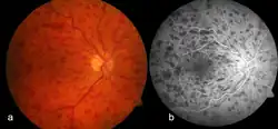 Durante la exploración del fondo de ojo mediante un oftalmoscopio pueden verse hemorragias en la retina que, partiendo del disco óptico, se extienden hacia la periferia. Las venas retinianas están dilatadas y son tortuosas. También pueden observarse exudados de tipo algodonoso causados por la falta de oxígeno (isquemia) y edema de papila.
