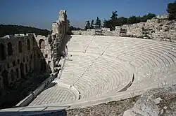 El Odeón de Herodes Ático es un edificio para audiciones musicales, erigido en el año 161 gracias a la gran fortuna del cónsul romano Herodes Ático, que lo hizo construir en memoria de su mujer, Apia Ania Regila, muerta el año anterior.