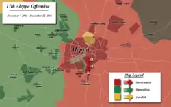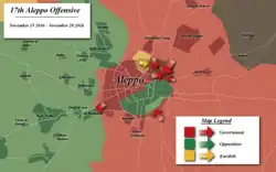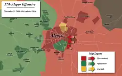La ofensiva de Alepo (noviembre-diciembre de 2016), denominada en código Operación Amanecer de la Victoria por las fuerzas gubernamentales,[40] fue una exitosa ofensiva militar lanzada por las Fuerzas Armadas Sirias y grupos aliados (SAA) contra los distritos controlados por los rebeldes en Alepo. La ofensiva se produjo después del final de la moratoria de los ataques aéreos de Rusia, y las Fuerzas Armadas rusas volvieron a realizar ataques aéreos pesados y con misiles de crucero contra las posiciones rebeldes en todo el noroeste de Siria. La ofensiva tuvo como resultado que las fuerzas gubernamentales tomaran el control de todas las partes del este y sur de Alepo controladas por los rebeldes, y la evacuación de las fuerzas rebeldes restantes.