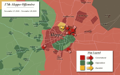 Al 28 de noviembre, toda la parte noreste de Alepo había caído.[8] Temprano en el día, el ejército tomó el control de Haydariyah.[107] Dos horas más tarde, las fuerzas gubernamentales también tomaron Sakhour,[108][109] dejando rodeados los distritos rebeldes de Sheikh Kheder y Sheikh Fares. Poco después, el ejército también se llevó a Sheikh Khider, junto con partes de Sheikh Fares. El resto de Sheikh Fares fue capturado por las fuerzas kurdas, que se confirmó que tenían el control de partes de Hallak, Bustan Al-Basha, Ba'ibdeen y Ayn Al-Tal también[110] después de avanzar desde el distrito de Sheikh Maqsood. La situación general se describió como "la mayor derrota de la oposición en Alepo desde 2012", y se rompió un estancamiento de cuatro años en la ciudad.[111]