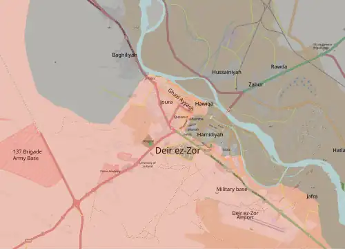 ![]() Situación en Deir ez-Zor para el 19 de enero de 2016 Control del Ejército sirio Control del Estado Islámico | |||||