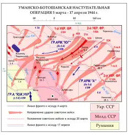 El 5 de marzo, Kóniev lanzó la ofensiva Uman-Botoşani, avanzó rápidamente y no tardó en cortar la línea de suministro del 1.er Ejército Panzer al capturar Chortkov el 23 de marzo. El 10 de marzo, el Segundo Frente Ucraniano destruyó dos cuerpos panzer al capturarlos en la caída de Uman.[35]