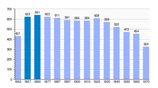 | Gráfica de evolución demográfica de Olmillos de Sasamón[4] entre 1842 y 1970 |