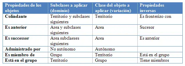 La ontología geopolítica se implementa con el lenguaje OWL (OWL el acrónimo del inglés Ontology Web Language, un lenguaje de marcado para publicar y compartir datos usando ontologías en la WWW). Se compone de las clases, las propiedades, las instancias y las restricciones de las clases y las propiedades. El cuadro 1 muestra todas las clases, proporciona una pequeña descripción de cada una y algunos ejemplos de las instancias que pertenecen a cada clase.[8] Los cuadros 2 y 3 muestran propiedades de los datos y los objetos.