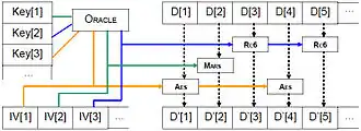- cada bloque de datos D [ i ] (128bit) está cifrado usando un algoritmo diferente f [ i ]