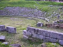 Se conserva también el antiguo teatro, cuya capacidad se estima en unos 5000 espectadores, que tuvo su origen en el siglo IV a. C. Fue construido sobre una antigua necrópolis micénica y las inscripciones que se han hallado demuestran que en el teatro se celebraban festivales musicales en honor de las Cárites, de Zeus y de Dioniso. Fue excavado a partir de 1973.[39]