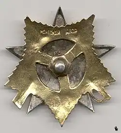 En el reverso, la insignia tiene un pasador roscado con una tuerca para sujetar la orden a la ropa.
