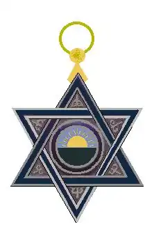 Una estrella salomónica (seis puntas) azul con adornos de oro en el interior de las puntas y un centro circular orlado en azul en el anverso, mostrando la representación de un Sol poniente en un mar verde azulado, y en el reverso una inscripción en árabe que dice "Muley el Medhi Ben Ismail glorificado por Dios". La cinta es verde con una franja blanca en el centro, en sentido vertical.[1][2]