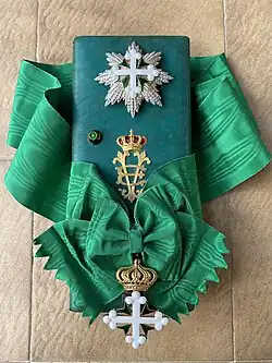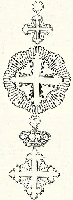 - Cavalieri di Gran Croce decorati del Gran Cordone (Caballeros de la Gran Cruz con Gran Cordón) - con un máximo de 60 miembros. Luce la insignia de 67 mm de diámetro bajo una corona real suspendida de una cinta, así como la estrella de 8 puntas.