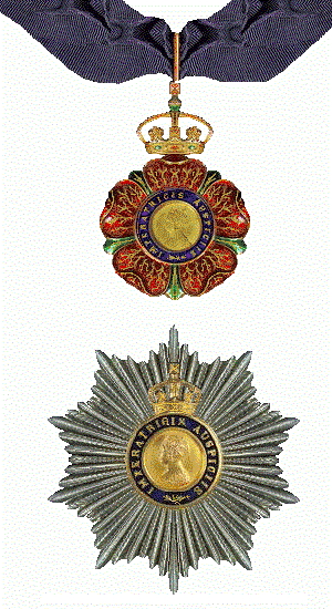 - La estrella, portada por los caballeros grandes comendadores y por los caballeros comendadores. Tenía 10 puntas, incluyendo rayos de oro y plata en el caso de los grandes comendadores, y solo de plata en el caso de los comendadores. En el centro tenía una imagen de la reina Victoria rodeada por un anillo azul oscuro con el lema y coronada por una corona.