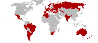 Alemania, Argelia, Argentina, Armenia, Australia, Austria, Azerbaiyán, Bélgica, Bosnia-Herzegovina, Brasil, Bulgaria, Chile, Chipre, Chequia, Croacia, Eslovaquia, Eslovenia, España, Francia, Georgia, Grecia, Hungría, India, Israel, Italia, Líbano, Luxemburgo, Malta, Marruecos, México, Moldavia, Montenegro, Noruega, Nueva Zelanda, Países Bajos, Perú, Portugal, Reino Unido, República Checa, República del Norte de Macedonia, Rumanía, Rusia, Serbia, Sudáfrica, Suecia, Suiza, Turquía, Ucrania, Uruguay y Uzbekistán.[1]