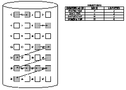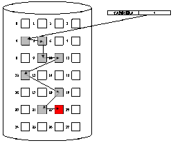 En este método, cada archivo es una lista ligada de bloques de disco. En el directorio hay un apuntador al bloque de inicio y un apuntador al bloque final para cada archivo. En cada uno de los bloques donde se encuentra un archivo hay un apuntador al siguiente bloque de la lista. Por ejemplo: