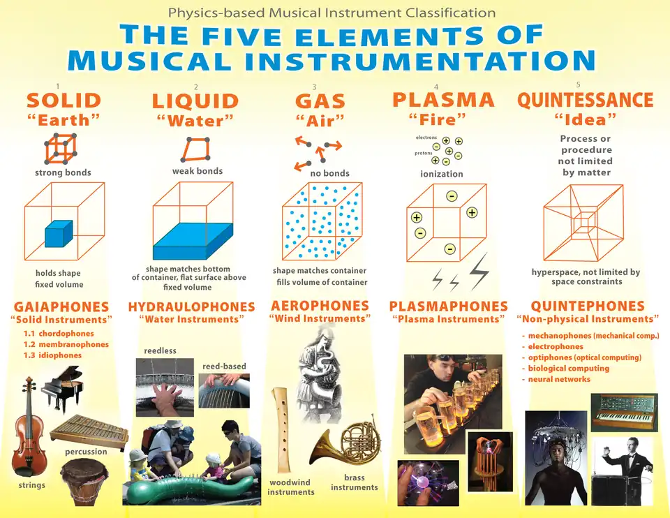 El mapa organológico elemental se remonta a Kartomi, Schaeffner, Yamaguchi y otros,[2] así como a los conceptos griegos y romanos acerca de la clasificación elemental de todos los objetos y no únicamente de los instrumentos musicales.[2] De este modo, elemental se refiere a un estado de la materia, así como a algo que le es intrínseco o innato (físico).[2][3]