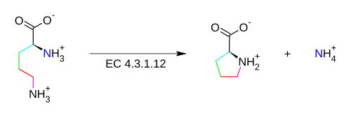 Por lo tanto, esta enzima posee un único sustrato, la ornitina, y dos productos, prolina y amonio.