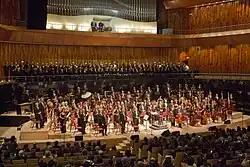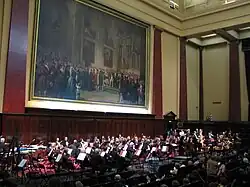 La OSN minutos antes de ejecutar la 2.ª sinfonía de Gustav Mahler el 2 de mayo de 2008 en el salón de actos de la Facultad de Derecho de la Universidad de Buenos Aires | ||