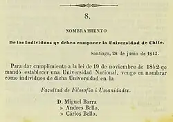 Aunque el proyecto de Bello no se plasmó totalmente, la Facultad de Humanidades de la Universidad de Chile propuso algunas de sus ideas en mayo de 1844 al gobierno del presidente Bulnes,[20] que siguió la recomendación y finalmente adoptó ese mismo año el uso de la nueva ortografía en la enseñanza y en la redacción de documentos oficiales. Las modificaciones adoptadas por el gobierno de Chile fueron las siguientes: