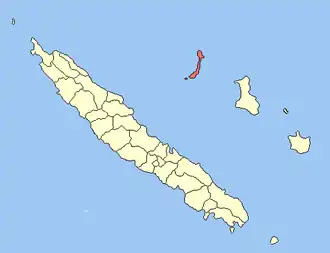 La superficie total es de 132,1 km², con una altitud máxima de 39 m. La isla es alargada de norte a sur formada por dos partes unidas por un estrecho istmo de 25 km de largo. Los extremos norte y sur se prolongan hacia el oeste por una barrera de coral y unos islotes diseminados. La costa oeste de la isla es una larga playa de 25 km.