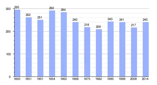 Los datos demográficos contemplados en este gráfico de la comuna de Ouville-la-Bien-Tournée[4] se han cogido de 1800 a 1999 de la página francesa EHESS/Cassini, y los demás datos de la página del INSEE.[5]