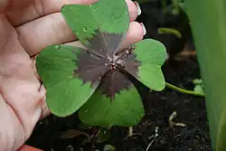 Oxalis tetraphylla (a menudo comercializada por su sinónimo O. deppei) es una planta de bulbo, propia de México. La variedad con el centro oscuro tiene como nombre común "Cruz de hierro", por el nombre de un cultivar; en estado salvaje se la conoce como alazán rosado de cuatro hojas y trébol de cuatro hojas (aunque no es una especie de trébol).