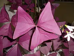 Las hojas de color granate oscuro son trifoliadas, como las especies del género de trébol Trifolium comúnmente denominadas trébol, de ahí el nombre de "trébol púrpura". Una característica interesante es que las hojas se cierran como un paraguas por la noche o cuando se las molesta. Las flores blancas o rosa pálido de cinco pétalos también cierran por la noche.[1]