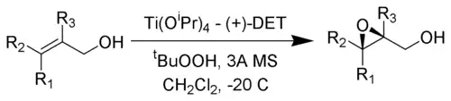 - Epoxidación de Sharpless de alcoholes alílicos usnado isopropóxido de titanio, tartrato de dietilo e hidroxoperóxido de t-butilo.[4]