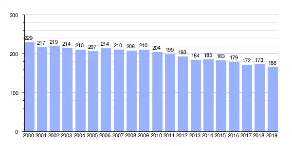 | Gráfica de evolución demográfica de Páramos entre 2000 y 2019 |