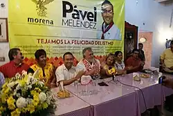 En el 2013,[21] después de un proceso interno (elecciones primarias) plagado de irregularidades en el proceso electoral estatal y tras su evidente rechazo a las llamadas reformas estructurales del Pacto por México, Pável Meléndez decidió renunciar al PRD[2] para incorporarse a la fundación del naciente partido Movimiento de Regeneración Nacional (Morena), creado por Andrés Manuel López Obrador, quien lo invitó a través de su primer dirigente nacional, Martí Batres Guadarrama, a ser promotor de Morena en el Distrito V Federal Electoral con cabecera en Tehuantepec y futuro candidato a diputado federal por mayoría relativa.[3]