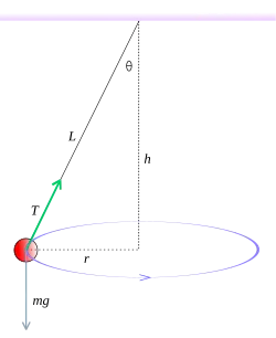 El péndulo cónico está constituido por un cuerpo pesado de pequeñas dimensiones (puntual, idealmente) suspendido de un punto fijo mediante un hilo inextensible y de masa despreciable. Su construcción es la misma que la de un péndulo simple, pero, a diferencia de este, el péndulo cónico no oscila, sino que la masa pendular describe una trayectoria circular en un plano horizontal con aceleración constante. Su nombre proviene del hecho de que el hilo traza una superficie cónica.