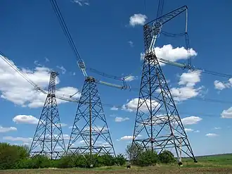 - Aumentar la tensión de las líneas (adaptando por supuesto todos los elementos de aislamiento y funcionamiento al mayor voltaje). Por ejemplo el ejecutivo chino, ante un fuerte aumento del consumo eléctrico, ha construido nuevas centrales (varias de ellas nucleares). Algunas de ellas (de carbón o hidráulicas) se han emplazado cerca de sus fuentes de energía, y por tanto tienen que transportar a largas distancias (a veces millares de kilómetros) la corriente que generan, lo que ocasiona significativas pérdidas. Para disminuirlas, la empresa estatal encargada de la red eléctrica ha construido líneas de tensión ultraalta, de 1 100 kilovoltios (kV, es decir, más de un millón de voltios), e incluso de voltajes todavía mayores,[7] con aparatos de interrupción especiales (de aislamiento gaseoso). Una línea de 1 100 kV y 140 km existe también en Japón, construida por TEPCO.[8]