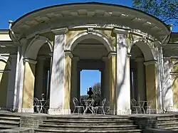 El pabellón, diseñado por Rossi en estilo neoclásico, fue construido para ofrecer un área de placer y refrigerio con vista al río, con un muelle donde amarrar los barcos. El pabellón sobrevivió al período soviético y fue parte de la restauración a gran escala del jardín a principios de la década de 2000. Como parte de esta obra, se colocó en el pabellón un busto del arquitecto Carlo Rossi.