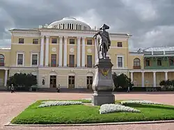 Estatua del emperador Pablo frente al palacio Pávlovsk.
