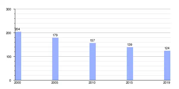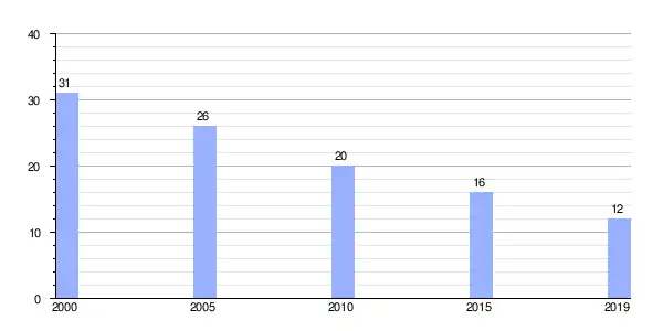 | Gráfica de evolución demográfica de Pacios (aldea) entre 2000 y 2019 |