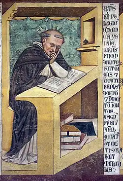 ![]() Fray Pelagio, retratado por Tommaso da Modena c. 1350 en la iglesia San Nicolò de Treviso. | ||