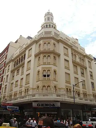 En el balcón que recorre todo el 1.º piso se destacan las inscripciones en caracteres arábigos (que dicen “Dios es grande”), y en las ventanas que dan a la ochava las columnas y las molduras con diseños típicos. En los laterales del 4.º piso hay balconadas con galería y columnas, y los pisos 5.º y 6.º tienen un retiro progresivo de la fachada. El frente del piso 5.º está especialmente ornamentado. En la ochava, el edificio está coronado por una torre que recuerda a los minaretes de las mezquitas.