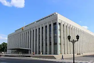 Su arquitectura es sencilla y lacónica. La fachada plana de cristales pulidos separados entre sí por estrechos pilones triedros de mármol blanco ofrece a la vista un espacioso vestíbulo y anchas escaleras.