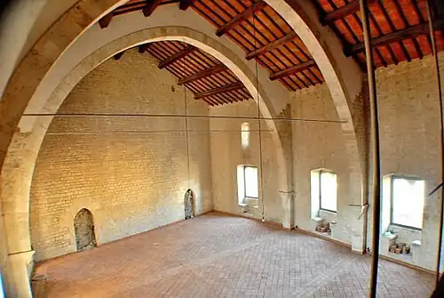 - ↑ Duro en este sentido es el juicio de G. Fontana y A. Spalvieri, Op.cit.,p. 10: "Questa serie di interventi, assolutamente scevri da qualsiasi interesse filologico, ha sconvolto interamente lo spazio interno del corpo di fabbrica ed ha fornito al tetto una conformazione non rispondente a nessun canone storico e stilistico, addirittura evidenziando nella falda esposta ad ovest un quadrilatero di massicce cordonature in cemento. (Esta serie de intervenciones, absolutamente carentes de cualquier interés filológico, ha conmocionado a todo el espacio interior del edificio y dio al techo una estructura que no se ajusta a ningun canon histórico y estilístico y al oeste muestra también un anillo de grandes bordillos de hormigón.)"