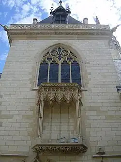 La capilla se encuentra por encima de la entrada; el tímpano de la ventana de esta capilla está decorado con una gran flor de lis acostada sobre dos corazones, un signo de homenaje al rey.[16]