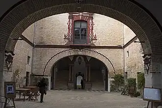 De gran importancia es también el patio central. Presenta planta cuadrada y doble galería porticada, con columnas toscanas de mármol y cuerpo cúbico a modo de cimacio los arcos son de medio punto en el piso inferior y rebajados en el superior. Estos arcos están realizados en ladrillo y presentan decoración de ménsulas y pinjantes en clave y enjutas. El cuerpo alto está recorrido por un barandal metálico. En el centro de dicho patio destaca una fuente de traza poligonal.