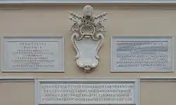 Sobre la fachada del palacio hay tres epígrafes que recuerdan la obra de otros tantos papas, en orden cronológico, Pablo V, Urbano VIII y Alejandro VII:[5]