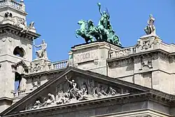 A ambos lados de la cuadriga, encima de pedestales que parecen unirse a las simas del frontón por unas prolongaciones en relieve, se presentan dos figuras sentadas, una representando al legislador y la otra al guardián de la ley, ambas obras del escultor János Fadrusz.[5] Los tres pedestales forman parte del ático de la estructura. Las otras muchas figuras que adornan la fachada y la azotea son personificaciones de las distintas artes y ciencias, obras de varios artistas, como József Róna, Gyula Donáth, Richárd Füredi o Béla Strohoffer.[3]